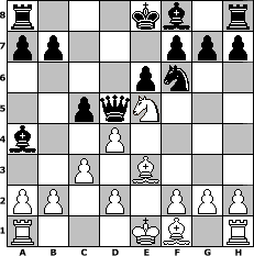 Partie-Notation im PGN-Format [Event "?"] [Site "www.mySchach.de"] [Date "2023.02.07"] [Round "?"] [White "pillepalle"] [Black "Bees@"] [ECO "D00"] [WhitemyELO "1997"] [BlackmyELO "1500"] [Result "0-1"] [TimeControl "10/864000"] [WhiteDays "10"] [BlackDays "10"] [MySchachNr "129359"] 1. d4 d5 2. e4 e6 3. Nc3 dxe4 4. Nxe4 Nd7 5. Nf3 Ngf6 6. Nxf6+ Nxf6 7. c3 c5 8. Ne5 Qd5 9. Qa4+ Bd7 10. Be3 Bxa4 0-1 Stellungs-Notation im FEN-Format r3kb1r/pp3ppp/4pn2/2pqN3/b2P4/2P1B3/PP1P1PPP/R3KB1R - KQkq - 0 11 Geschlagene Figuren Weiss: Geschlagene Figuren Schwarz: Klicken Sie auf eine geschlagene Figur um den gewünschten Zug darzustellen!