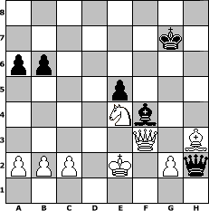 Partie-Notation im PGN-Format [Event "Sizillianisch"] [Site "www.mySchach.de"] [Date "2006.11.04"] [Round "1"] [White "Phantasos"] [Black "ujack1961"] [ECO "B41"] [WhitemyELO "2084"] [BlackmyELO "1851"] [Result "1-0"] [TimeControl "10/864000"] [WhiteDays "10"] [BlackDays "10"] [MySchachNr "29759"] 1. e4 c5 2. Nf3 e6 3. d4 cxd4 4. Nxd4 Nf6 5. Nc3 d6 6. Be2 Be7 7. O-O O-O 8. Be3 Nc6 9. Nb3 h6 10. f4 d5 11. e5 Nd7 12. Rf3 b6 13. Rg3 a6 14. Bh5 Bh4 15. Rh3 Be7 16. Qg4 d4 17. Rg3 g5 18. Nxd4 Nxd4 19. Bxd4 Nf6 20. exf6 Qxd4+ 21. Kh1 Qxf6 22. fxg5 hxg5 23. Qe2 Ra7 24. h4 Qf4 25. Rg4 Qf5 26. hxg5 Bd6 27. Ne4 Qe5 28. Rh4 Bb8 29. Qd3 f5 30. gxf6 Rh7 31. Qf3 Qf5 32. Qe2 Bf4 33. Rf1 e5 34. Kg1 Kh8 35. Bg4 Qg6 36. Rxh7+ Qxh7 37. Bxc8 Qh2+ 38. Kf2 Rxf6 39. Bh3 Bg3+ 40. Ke3 Rxf1 41. Qxf1 Bf4+ 42. Ke2 Kg7 43. Qf3 1-0 Stellungs-Notation im FEN-Format 8/6k1/pp6/4p3/4Nb2/5Q1B/PPP1K1Pq/8 - - - 4 43 Geschlagene Figuren Weiss: Geschlagene Figuren Schwarz: Klicken Sie auf eine geschlagene Figur um den gewünschten Zug darzustellen!