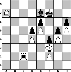 Partie-Notation im PGN-Format [Event "Knight Moves I"] [Site "www.mySchach.de"] [Date "2008.12.10"] [Round "1"] [White "Greenhorn"] [Black "RashimIbenRohal"] [ECO "D80"] [WhitemyELO "1568"] [BlackmyELO "1559"] [Result "0-1"] [TimeControl "10/2592000"] [WhiteDays "29"] [BlackDays "30"] [MySchachNr "50618"] 1. d4 Nf6 2. c4 g6 3. Nc3 d5 4. e3 c6 5. cxd5 Nxd5 6. Bc4 Bg7 7. h3 O-O 8. Nf3 e6 9. e4 Nb6 10. Bb3 Na6 11. a3 Nc7 12. O-O Bd7 13. e5 Ncd5 14. Bg5 Qc7 15. Rc1 Nxc3 16. Rxc3 Nd5 17. Rc1 h6 18. Bd2 Rac8 19. h4 f5 20. h5 g5 21. Re1 Qb6 22. Bxd5 cxd5 23. Bc3 Rc6 24. Nd2 Rfc8 25. g4 f4 26. Nf3 Rc4 27. Nd2 R4c7 28. Rb1 a5 29. a4 Qc6 30. Bxa5 b6 31. Bc3 Qxa4 32. Qc1 Qa6 33. Qc2 b5 34. Ra1 Qb7 35. Qg6 b4 36. Nf3 bxc3 37. bxc3 Qc6 38. Rec1 Be8 39. Qd3 Qc4 40. Qb1 Qe2 41. Kg2 Rxc3 42. Rxc3 Rxc3 43. Nh2 Rc2 44. Qf1 Qxf1+ 45. Kxf1 Bb5+ 46. Kg2 Bf8 47. Nf3 Be2 48. Ra8 Bxf3+ 49. Kxf3 Kf7 50. Ra7+ Be7 0-1 Stellungs-Notation im FEN-Format 8/R3bk2/4p2p/3pP1pP/3P1pP1/5K2/2r2P2/8 - - - 3 51 Geschlagene Figuren Weiss: Geschlagene Figuren Schwarz: Klicken Sie auf eine geschlagene Figur um den gewünschten Zug darzustellen!