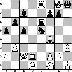 Partie-Notation im PGN-Format [Event "Bremer Schl"] [Site "www.mySchach.de"] [Date "2008.11.01"] [Round "2"] [White "Phantasos"] [Black "Baehr008"] [ECO "A46"] [WhitemyELO "2124"] [BlackmyELO "1996"] [Result "1-0"] [TimeControl "10/2592000"] [WhiteDays "18"] [BlackDays "79"] [MySchachNr "49440"] 1. d4 Nf6 2. Nf3 d5 3. c4 c6 4. Nc3 e6 5. e3 Nbd7 6. Qc2 Bd6 7. Bd3 O-O 8. O-O Re8 9. Rd1 Qe7 10. e4 dxc4 11. Bxc4 e5 12. h3 exd4 13. Nxd4 Bc7 14. Be3 Nxe4 15. Nxe4 Qxe4 16. Bd3 Qe5 17. Bxh7+ Kh8 18. Nf3 Qh5 19. Bf5 Ne5 20. Nd4 Kg8 21. b3 Bxf5 22. Nxf5 Re6 23. Rac1 Rae8 24. Kh1 a6 25. Ng3 Qh8 26. Nf1 a5 27. Rd2 b6 28. Rcd1 c5 29. Bf4 1-0 Stellungs-Notation im FEN-Format 4r1kq/2b2pp1/1p2r3/p1p1n3/5B2/1P5P/P1QR1PP1/3R1N1K - - - 1 29 Geschlagene Figuren Weiss: Geschlagene Figuren Schwarz: Klicken Sie auf eine geschlagene Figur um den gewünschten Zug darzustellen!