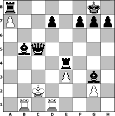 Partie-Notation im PGN-Format [Event "Adevnt Advent "] [Site "www.mySchach.de"] [Date "2018.12.04"] [Round "1"] [White "alpacino"] [Black "MiFie"] [ECO "C25"] [WhitemyELO "1291"] [BlackmyELO "1102"] [Result "0-1"] [TimeControl "10/2592000"] [WhiteDays "095"] [BlackDays "117"] [MySchachNr "113698"] 1. e4 e5 2. Nc3 Nc6 3. Nf3 Bc5 4. d4 Bd6 5. d5 Nb4 6. a3 Na6 7. Bd3 Nf6 8. Bxa6 bxa6 9. O-O O-O 10. Be3 Rb8 11. Bxa7 Rxb2 12. a4 c5 13. a5 Qc7 14. Bb6 Qb7 15. Na4 Rb4 16. c3 Rxe4 17. Ng5 Rg4 18. Nf3 Nxd5 19. Ne1 Rc4 20. Nf3 e4 21. Nh4 e3 22. Qe2 Rxh4 23. fxe3 Bxh2+ 24. Kf2 Qc6 25. Nxc5 Nxc3 26. Qxa6 Bxa6 27. Rfc1 Qf6+ 28. Ke1 Bb5 29. a6 Ne4 30. Nxe4 Rxe4 31. a7 Bg3+ 32. Kd1 Qd6+ 33. Kc2 Ra8 34. Rd1 Qxb6 35. Rab1 Qc5+ 0-1 Stellungs-Notation im FEN-Format r5k1/P2p1ppp/8/1bq5/4r3/4P1b1/2K3P1/1R1R4 - - - 2 36 Geschlagene Figuren Weiss: Geschlagene Figuren Schwarz: Klicken Sie auf eine geschlagene Figur um den gewünschten Zug darzustellen!