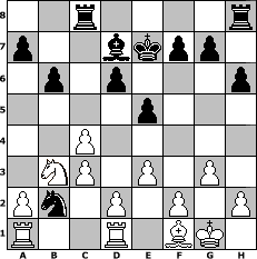 Partie-Notation im PGN-Format [Event "CN OPEN 2011"] [Site "www.mySchach.de"] [Date "2011.11.29"] [Round "1"] [White "Steffi"] [Black "HenrySchinasky"] [ECO "E30"] [WhitemyELO "1555"] [BlackmyELO "2097"] [Result "0-1"] [TimeControl "10/2592000"] [WhiteDays "01"] [BlackDays "30"] [MySchachNr "77832"] 1. d4 Nf6 2. c4 e6 3. Nc3 Bb4 4. Bg5 c5 5. dxc5 h6 6. Bxf6 Qxf6 7. Qc2 Bxc3+ 8. Qxc3 Qxc3+ 9. bxc3 Na6 10. Nf3 Nxc5 11. e3 d6 12. g3 b6 13. Bg2 Ke7 14. O-O Bd7 15. Nd4 Rac8 16. Rfd1 Na4 17. Bf1 e5 18. Nb3 Nb2 0-1 Stellungs-Notation im FEN-Format 2r4r/p2bkpp1/1p1p3p/4p3/2P5/1NP1P1P1/Pn1P1P1P/R2R1BK1 - - - 2 19 Geschlagene Figuren Weiss: Geschlagene Figuren Schwarz: Klicken Sie auf eine geschlagene Figur um den gewünschten Zug darzustellen!