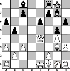 Partie-Notation im PGN-Format [Event "^^Lust, Laune und Spannung am Schach!!!^^"] [Site "www.mySchach.de"] [Date "2007.09.24"] [Round "1"] [White "bernhard"] [Black "Knight"] [ECO "A06"] [WhitemyELO "1605"] [BlackmyELO "1290"] [Result "1-0"] [TimeControl "10/864000"] [WhiteDays "19"] [BlackDays "19"] [MySchachNr "38468"] 1. Nf3 d5 2. d4 Nc6 3. Nc3 Nf6 4. Bf4 a6 5. h3 e6 6. g4 h6 7. a3 g5 8. Bg3 Bg7 9. Qd3 b5 10. e4 dxe4 11. Nxe4 Nxe4 12. Qxe4 Nxd4 13. Nxd4 Qxd4 14. Qxa8 O-O 15. c3 Qe4+ 16. Qxe4 1-0 Stellungs-Notation im FEN-Format 2b2rk1/2p2pb1/p3p2p/1p4p1/4Q1P1/P1P3BP/1P3P2/R3KBNR - KQ - 0 16 Geschlagene Figuren Weiss: Geschlagene Figuren Schwarz: Klicken Sie auf eine geschlagene Figur um den gewünschten Zug darzustellen!