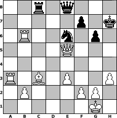 Partie-Notation im PGN-Format [Event "1. Nordsachsenturnier"] [Site "www.mySchach.de"] [Date "2015.03.13"] [Round "1"] [White "peter58"] [Black "faustballer"] [ECO "D20"] [WhitemyELO "1526"] [BlackmyELO "1545"] [Result "1-0"] [TimeControl "10/1728000"] [WhiteDays "20"] [BlackDays "20"] [MySchachNr "98525"] 1. d4 d5 2. c4 dxc4 3. e3 b5 4. a4 c6 5. axb5 cxb5 6. Qf3 Bb7 7. Qxb7 Nd7 8. Qxb5 e6 9. Bxc4 Ngf6 10. Nf3 Bd6 11. Ra6 Bc7 12. O-O O-O 13. Bd3 Bb6 14. Nc3 Rb8 15. Qa4 Qe7 16. Qc2 Rfc8 17. Ng5 Nf8 18. Ra4 e5 19. dxe5 Qxe5 20. Nf3 Qd6 21. Rd1 Qe7 22. Ng5 Rc5 23. Nge4 Nxe4 24. Rxe4 Qc7 25. Bd2 Rh5 26. h3 Ba5 27. Ra1 Rc5 28. Rh4 g6 29. Ra3 Ne6 30. Rha4 Bb6 31. Rb4 Rd8 32. Qb1 Qd7 33. Ne4 Qe7 34. Bc3 Rxd3 35. Qxd3 Rc8 36. Nf6+ Kf8 37. Nxh7+ Ke8 38. Nf6+ Kf8 39. Nd7+ Kg8 40. Nxb6 axb6 41. Rxb6 Kh7 42. Qd6 Qe8 43. Qe5 1-0 Stellungs-Notation im FEN-Format 2r1q3/5p1k/1R2n1p1/4Q3/8/R1B1P2P/1P3PP1/6K1 - - - 4 43 Geschlagene Figuren Weiss: Geschlagene Figuren Schwarz: Klicken Sie auf eine geschlagene Figur um den gewünschten Zug darzustellen!