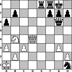 Partie-Notation im PGN-Format [Event "Clubmeisterschaft 2018"] [Site "www.mySchach.de"] [Date "2018.08.15"] [Round "1"] [White "wolni55"] [Black "HenrySchinasky"] [ECO "B02"] [WhitemyELO "1403"] [BlackmyELO "2143"] [Result "0-1"] [TimeControl "10/2592000"] [WhiteDays "76"] [BlackDays "84"] [MySchachNr "112828"] 1. e4 Nf6 2. Nc3 d5 3. e5 Nfd7 4. d4 e6 5. a3 c5 6. Nf3 Nc6 7. Bf4 cxd4 8. Nxd4 Ncxe5 9. Bb5 Ng6 10. Qg4 a6 11. Be2 Nxf4 12. Qxf4 e5 13. Qe3 Bc5 14. Nxd5 O-O 15. O-O-O Bxd4 16. Qf3 Nc5 17. Nb4 Be6 18. c3 Qg5+ 19. Kb1 Qg6+ 20. Bd3 e4 21. Bxe4 Nxe4 22. Ka1 Bg4 23. Qd3 Bxd1 24. Qxd1 Nxf2 25. Qxd4 Nxh1 26. g3 Rae8 0-1 Stellungs-Notation im FEN-Format 4rrk1/1p3ppp/p5q1/8/1N1Q4/P1P3P1/1P5P/K6n - - - 1 27 Geschlagene Figuren Weiss: Geschlagene Figuren Schwarz: Klicken Sie auf eine geschlagene Figur um den gewünschten Zug darzustellen!