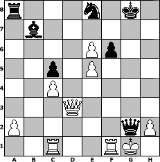 Partie-Notation im PGN-Format [Event "Der HSF feiert Geburtstag- feiert dabei gern mit!"] [Site "www.mySchach.de"] [Date "2011.04.30"] [Round "1"] [White "hape50"] [Black "Knight"] [ECO "A43"] [WhitemyELO "1324"] [BlackmyELO "1171"] [Result "0-1"] [TimeControl "10/2592000"] [WhiteDays "30"] [BlackDays "30"] [MySchachNr "73643"] 1. d4 c5 2. d5 d6 3. e4 Nf6 4. f3 e5 5. Bd3 g6 6. Ne2 Bg7 7. b3 O-O 8. O-O a5 9. Bb2 Re8 10. Nd2 Nbd7 11. Nc4 b5 12. Nxd6 Re7 13. Nxb5 a4 14. bxa4 Rxa4 15. c4 Nb6 16. Nec3 Ra8 17. d6 Rd7 18. Ne2 Bb7 19. Bxe5 Ne8 20. f4 Bxe5 21. fxe5 f6 22. e6 Rxd6 23. Nxd6 Qxd6 24. Nf4 Na4 25. Qg4 Qe7 26. Rac1 Nb2 27. Nxg6 hxg6 28. Qxg6+ Qg7 29. e5 Nxd3 30. Qxd3 Qxg2# 0-1 Stellungs-Notation im FEN-Format r3n1k1/1b6/4Pp2/2p1P3/2P5/3Q4/P5qP/2R2RK1 - - - 0 31 Geschlagene Figuren Weiss: Geschlagene Figuren Schwarz: Klicken Sie auf eine geschlagene Figur um den gewünschten Zug darzustellen!