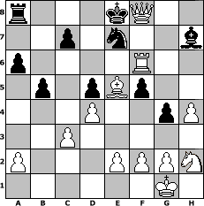 Partie-Notation im PGN-Format [Event "Albspiele 20"] [Site "www.mySchach.de"] [Date "2012.05.01"] [Round "1"] [White "Haki"] [Black "Knight"] [ECO "C70"] [WhitemyELO "1334"] [BlackmyELO "1218"] [Result "1-0"] [TimeControl "10/1728000"] [WhiteDays "20"] [BlackDays "20"] [MySchachNr "81543"] 1. e4 e5 2. Nf3 Nc6 3. Bb5 a6 4. Ba4 b5 5. Bb3 Bc5 6. c3 Nf6 7. Bc2 Bb7 8. d4 exd4 9. cxd4 Bb4+ 10. Nc3 O-O 11. O-O Re8 12. Bd2 Bxc3 13. bxc3 Nxe4 14. Bxe4 Rxe4 15. Re1 Rxe1+ 16. Qxe1 d5 17. Bg5 f6 18. Qe6+ Kh8 19. Bf4 g5 20. Bg3 Bc8 21. Qe3 h6 22. h4 Bf5 23. Re1 g4 24. Qxh6+ Bh7 25. Nh2 f5 26. Re6 Ne7 27. Qf6+ Kg8 28. Be5 Qf8 29. Qh8+ Kf7 30. Rf6+ Ke8 31. Qxf8+ 1-0 Stellungs-Notation im FEN-Format r3kQ2/2p1n2b/p4R2/1p1pBp2/3P2pP/2P5/P3PPPN/6K1 - - - 0 31 Geschlagene Figuren Weiss: Geschlagene Figuren Schwarz: Klicken Sie auf eine geschlagene Figur um den gewünschten Zug darzustellen!