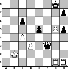 Partie-Notation im PGN-Format [Event "Wanderpokal 2007"] [Site "www.mySchach.de"] [Date "2007.06.23"] [Round "1"] [White "wasserandy"] [Black "MartinSilies"] [Variant "Fischerrandom"] [SetUp "1"] [FEN "rkbnnbqr/pppppppp/8/8/8/8/PPPPPPPP/RKBNNBQR w KQkq - 0 1"] [WhitemyELO "1840"] [BlackmyELO "1426"] [Result "1/2-1/2"] [TimeControl "10/864000"] [WhiteDays "29"] [BlackDays "17"] [MySchachNr "35941"] 1. e4 e5 2. Bc4 Ne6 3. Nf3 d6 4. d3 Be7 5. Nc3 Nf6 6. h3 Bd7 7. Be3 g6 8. O-O-O Qg7 9. g4 O-O 10. Qh2 c6 11. Rdg1 b5 12. Bb3 a5 13. Bxe6 Bxe6 14. Kb1 a4 15. Nh4 b4 16. Ne2 Nxe4 17. Nf5 Bxf5 18. gxf5 Nf6 19. h4 b3 20. c3 bxa2+ 21. Kxa2 a3 22. b3 Nh5 23. f4 Rfb8 24. fxg6 fxg6 25. fxe5 dxe5 26. Ng3 Qf7 27. c4 Rxb3 28. Kxb3 Rb8+ 29. Ka2 Rb2+ 30. Qxb2 axb2 31. Nxh5 Qf3 32. Bg5 Bxg5 33. hxg5 gxh5 34. Kxb2 1/2-1/2 Stellungs-Notation im FEN-Format 6k1/7p/2p5/4p1Pp/2P5/3P1q2/1K6/6RR - - - 0 34 Geschlagene Figuren Weiss: Geschlagene Figuren Schwarz: Klicken Sie auf eine geschlagene Figur um den gewünschten Zug darzustellen!