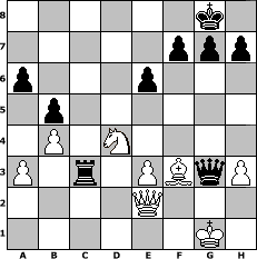 Partie-Notation im PGN-Format [Event "Schach dem Nikolaus V"] [Site "www.mySchach.de"] [Date "2015.12.03"] [Round "1"] [White "beowulf"] [Black "Ziegert"] [ECO "A13"] [WhitemyELO "1359"] [BlackmyELO "1460"] [Result "0-1"] [TimeControl "10/2592000"] [WhiteDays "116"] [BlackDays "067"] [MySchachNr "101485"] 1. c4 e6 2. d4 d5 3. Nf3 Nf6 4. Bg5 Be7 5. Nc3 O-O 6. e3 dxc4 7. Bxc4 a6 8. O-O c5 9. dxc5 Bxc5 10. a3 b5 11. Be2 Bb7 12. Qc2 Be7 13. Rfd1 Qc7 14. b4 Nbd7 15. Rd2 Rac8 16. Rc1 Ne5 17. Qb2 Bxf3 18. Bxf3 Nc4 19. Qa2 Nxd2 20. Qxd2 Rfd8 21. Qe1 Nd5 22. Bxe7 Nxe7 23. Ne2 Qb6 24. Rxc8 Rxc8 25. h3 Nd5 26. Nd4 Rc3 27. Qe2 Qc7 28. g3 Nxe3 29. fxe3 Qxg3+ 0-1 Stellungs-Notation im FEN-Format 6k1/5ppp/p3p3/1p6/1P1N4/P1r1PBqP/4Q3/6K1 - - - 0 30 Geschlagene Figuren Weiss: Geschlagene Figuren Schwarz: Klicken Sie auf eine geschlagene Figur um den gewünschten Zug darzustellen!