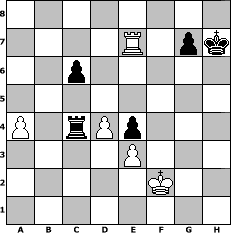 Partie-Notation im PGN-Format [Event "2011 geht es rund!"] [Site "www.mySchach.de"] [Date "2010.12.20"] [Round "1"] [White "Duschgel"] [Black "werderfan"] [ECO "A22"] [WhitemyELO "1579"] [BlackmyELO "1493"] [Result "1/2-1/2"] [TimeControl "10/864000"] [WhiteDays "48"] [BlackDays "42"] [MySchachNr "70665"] 1. c4 e5 2. Nc3 Nf6 3. g3 d5 4. cxd5 Nxd5 5. Bg2 c6 6. Nf3 Nxc3 7. bxc3 Bd6 8. a4 O-O 9. Ba3 Bxa3 10. Rxa3 Re8 11. O-O h6 12. d3 Bg4 13. h3 Bh5 14. Rb3 Qc7 15. Nd2 Nd7 16. g4 Bg6 17. Qb1 Nc5 18. Ra3 Rad8 19. Qb4 Na6 20. Qc4 Qd6 21. Ra2 h5 22. Rb1 Rd7 23. Bf3 hxg4 24. Bxg4 Rde7 25. Bf3 Nc5 26. Be4 Bxe4 27. Nxe4 Nxe4 28. Qxe4 Qh6 29. Kh2 f5 30. Qc4+ Kh8 31. Rab2 e4 32. Rxb7 Qf4+ 33. Kg1 Re6 34. e3 Rg6+ 35. Kf1 Qf3 36. d4 Qxh3+ 37. Ke1 Rg1+ 38. Kd2 Rg2 39. Qe2 Qh4 40. Rf1 f4 41. exf4 Qxf4+ 42. Qe3 Qf3 43. Ke1 Rf8 44. Re7 Qxe3+ 45. fxe3 Rxf1+ 46. Kxf1 Rc2 47. Rxa7 Rxc3 48. Kf2 Kh7 49. Re7 Rc4 1/2-1/2 Stellungs-Notation im FEN-Format 8/4R1pk/2p5/8/P1rPp3/4P3/5K2/8 - - - 4 50 Geschlagene Figuren Weiss: Geschlagene Figuren Schwarz: Klicken Sie auf eine geschlagene Figur um den gewünschten Zug darzustellen!