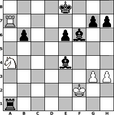 Partie-Notation im PGN-Format [Event "5er3"] [Site "www.mySchach.de"] [Date "2017.12.17"] [Round "1"] [White "martinus"] [Black "lisama"] [ECO "C21"] [WhitemyELO "1723"] [BlackmyELO "1653"] [Result "0-1"] [TimeControl "10/3456000"] [WhiteDays "38"] [BlackDays "40"] [MySchachNr "110739"] 1. e4 e5 2. d4 exd4 3. c3 dxc3 4. Nxc3 d6 5. Bc4 Nc6 6. Qb3 Ne5 7. f4 Nxc4 8. Qxc4 Be7 9. Nf3 Nf6 10. O-O O-O 11. Rd1 c6 12. e5 Qb6+ 13. Nd4 dxe5 14. fxe5 Be6 15. Qe2 Bg4 16. Qf2 Bxd1 17. exf6 Bxf6 18. Be3 Bg4 19. Ne6 Bh4 20. g3 fxe6 21. Bxb6 Rxf2 22. Bxf2 Be7 23. Re1 b6 24. Kg2 Rf8 25. h3 Bf3+ 26. Kg1 Kf7 27. Re3 Bd5 28. a3 Bf6 29. Na4 c5 30. b4 cxb4 31. axb4 Rc8 32. Re1 Rc4 33. Rb1 Be4 34. Rd1 Rxb4 35. Rd7+ Ke8 36. Rxa7 Rb1+ 37. Be1 Rxe1+ 38. Kf2 Ra1 0-1 Stellungs-Notation im FEN-Format 4k3/R5pp/1p2pb2/8/N3b3/6PP/5K2/r7 - - - 2 39 Geschlagene Figuren Weiss: Geschlagene Figuren Schwarz: Klicken Sie auf eine geschlagene Figur um den gewünschten Zug darzustellen!