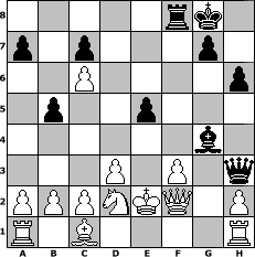 Partie-Notation im PGN-Format [Event "ADOBE FLASH PLAYER IS OUR GOD"] [Site "www.mySchach.de"] [Date "2020.12.11"] [Round "1"] [White "kalle"] [Black "alibengali"] [ECO "C57"] [WhitemyELO "1564"] [BlackmyELO "1642"] [Result "1-0"] [TimeControl "10/1728000"] [WhiteDays "58"] [BlackDays "58"] [MySchachNr "120184"] 1. e4 e5 2. Nf3 Nc6 3. Bc4 Nf6 4. Ng5 d5 5. exd5 b5 6. Bf1 h6 7. Nxf7 Kxf7 8. dxc6 Bc5 9. Be2 Bxf2+ 10. Kxf2 Ne4+ 11. Kf1 Rf8 12. d3 Kg8+ 13. Bf3 Bg4 14. Qe2 Rxf3+ 15. gxf3 Bh3+ 16. Kg1 Qf6 17. Qxe4 Rf8 18. Kf2 Bf5 19. Qe3 Bg4 20. Nd2 Qh4+ 21. Ke2 Qh3 22. Qf2 1-0 Stellungs-Notation im FEN-Format 5rk1/p1p3p1/2P4p/1p2p3/6b1/3P1P1q/PPPNKQ1P/R1B4R - - - 10 22 Geschlagene Figuren Weiss: Geschlagene Figuren Schwarz: Klicken Sie auf eine geschlagene Figur um den gewünschten Zug darzustellen!