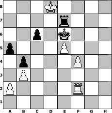 Partie-Notation im PGN-Format [Event "unter uns Nr. 15, Weihnachtsturnier"] [Site "www.mySchach.de"] [Date "2013.12.24"] [Round "1"] [White "borsti"] [Black "lotchi"] [ECO "C65"] [WhitemyELO "1269"] [BlackmyELO "1160"] [Result "1/2-1/2"] [TimeControl "10/864000"] [WhiteDays "60"] [BlackDays "44"] [MySchachNr "91805"] 1. e4 e5 2. Nf3 Nc6 3. Bb5 Nf6 4. d3 Bb4+ 5. Bd2 O-O 6. Bxc6 Bxd2+ 7. Qxd2 dxc6 8. Nxe5 c5 9. Nc3 Re8 10. Nf3 Bg4 11. O-O Bxf3 12. gxf3 a6 13. Rfe1 Qd4 14. Qe3 Qxe3 15. Rxe3 c6 16. Na4 Nd7 17. Rd1 b5 18. Nc3 b4 19. Na4 f6 20. d4 c4 21. Nc5 Nxc5 22. dxc5 Red8 23. Ree1 Kf7 24. h4 Ra7 25. b3 Rad7 26. Rxd7+ Rxd7 27. Re2 cxb3 28. cxb3 Rd3 29. Kg2 Rc3 30. Kg3 Rxc5 31. Kg4 h6 32. f4 g6 33. f5 h5+ 34. Kf4 g5+ 35. hxg5 fxg5+ 36. Kxg5 a5 37. e5 Ke8 38. Kxh5 Ke7 39. Kg6 Rc1 40. f6+ Ke6 41. f7 Rg1+ 42. Kh5 Rh1+ 43. Kg6 Rg1+ 44. Kh6 Rh1+ 45. Kg7 Rg1+ 46. Kf8 Rg5 47. f4 Rf5 48. Rf2 Rxf7+ 49. Ke8 Re7+ 50. Kd8 Rd7+ 51. Ke8 Re7+ 52. Kd8 1/2-1/2 Stellungs-Notation im FEN-Format 3K4/4r3/2p1k3/p3P3/1p3P2/1P6/P4R2/8 - - - 7 52 Geschlagene Figuren Weiss: Geschlagene Figuren Schwarz: Klicken Sie auf eine geschlagene Figur um den gewünschten Zug darzustellen!