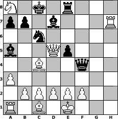 Partie-Notation im PGN-Format [Event "Sibirk"] [Site "www.mySchach.de"] [Date "2005.03.14"] [Round "2"] [White "Juri"] [Black "Andylein1989"] [ECO "C55"] [WhitemyELO "1372"] [BlackmyELO "1322"] [Result "1-0"] [TimeControl "10/2592000"] [WhiteDays "58"] [BlackDays "56"] [MySchachNr "11154"] 1. e4 e5 2. Nf3 Nc6 3. Bc4 Nf6 4. Nc3 Bb4 5. Ng5 d5 6. exd5 Nxd5 7. Nxd5 Qxg5 8. Nxc7+ Kd7 9. Nxa8 Qxg2 10. Rf1 Qxh2 11. Qg4+ Kd8 12. Qxg7 Re8 13. Qxf7 Bd7 14. Qd5 Kc8 15. a3 Ba5 16. Rh1 Qf4 17. Rxh7 1-0 Stellungs-Notation im FEN-Format N1k1r3/pp1b3R/2n5/b2Qp3/2B2q2/P7/1PPPPP2/R1B1K3 - Q - 0 17 Geschlagene Figuren Weiss: Geschlagene Figuren Schwarz: Klicken Sie auf eine geschlagene Figur um den gewünschten Zug darzustellen!