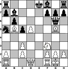 Partie-Notation im PGN-Format [Event "1.Schaltjahresturnier@mySchach"] [Site "www.mySchach.de"] [Date "2004.02.29"] [Round "1"] [White "Tarot"] [Black "kalle"] [ECO "A18"] [WhitemyELO "1715"] [BlackmyELO "1681"] [Result "1-0"] [TimeControl "10/1728000"] [WhiteDays "39"] [BlackDays "35"] [MySchachNr "2603"] 1. c4 Nf6 2. Nc3 e6 3. e4 d5 4. e5 d4 5. exf6 dxc3 6. bxc3 Qxf6 7. Nf3 b6 8. d4 Bb7 9. Be2 c5 10. O-O Nc6 11. Bg5 Qg6 12. d5 exd5 13. cxd5 Na5 14. Bb5+ 1-0 Stellungs-Notation im FEN-Format r3kb1r/pb3ppp/1p4q1/nBpP2B1/8/2P2N2/P1P2PPP/R2Q1RK1 - kq - 2 14 Geschlagene Figuren Weiss: ![]() ![]() ![]() ![]() ![]() ![]() ![]() ![]() ![]() ![]() ![]() ![]() ![]() ![]() ![]() Geschlagene Figuren Schwarz: ![]() ![]() ![]() ![]() ![]() ![]() ![]() ![]() ![]() ![]() ![]() ![]() ![]() ![]() ![]() Klicken Sie auf eine geschlagene Figur um den gewünschten Zug darzustellen!