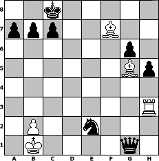 Partie-Notation im PGN-Format [Event "Herbstturnier 2022"] [Site "www.mySchach.de"] [Date "2022.09.26"] [Round "2"] [White "beowulf"] [Black "alibengali"] [ECO "A02"] [WhitemyELO "1508"] [BlackmyELO "1707"] [Result "0-1"] [TimeControl "10/1728000"] [WhiteDays "80"] [BlackDays "63"] [MySchachNr "127292"] 1. f4 e5 2. fxe5 d6 3. exd6 Bxd6 4. Nf3 Bg4 5. Nc3 Bxf3 6. exf3 Qh4+ 7. g3 Bxg3+ 8. hxg3 Qxg3+ 9. Ke2 Nc6 10. Rh3 Nd4+ 11. Ke3 Nf5+ 12. Kd3 O-O-O+ 13. Kc4 Qf4+ 14. Ne4 Nf6 15. d3 Rd4+ 16. Kb3 Qe5 17. a4 Qd5+ 18. c4 Rxc4 19. Ka3 Nxe4 20. fxe4 Qd6+ 21. Ka2 Rxe4 22. Qf3 Rxa4+ 23. Kb1 Rxa1+ 24. Kxa1 g6 25. Bf4 Qa6+ 26. Kb1 Re8 27. Qf2 h5 28. d4 Qb6 29. Bc4 Nxd4 30. Bxf7 Re2 31. Qxe2 Nxe2 32. Bg5 Qg1+ 0-1 Stellungs-Notation im FEN-Format 2k5/ppp2B2/6p1/6Bp/8/7R/1P2n3/1K4q1 - - - 2 33 Geschlagene Figuren Weiss: Geschlagene Figuren Schwarz: Klicken Sie auf eine geschlagene Figur um den gewünschten Zug darzustellen!
