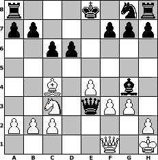 Partie-Notation im PGN-Format [Event "Eine Chance f"] [Site "www.mySchach.de"] [Date "2008.08.01"] [Round "2"] [White "Steppenwolf"] [Black "Helmut48"] [ECO "C60"] [WhitemyELO "1173"] [BlackmyELO "1409"] [Result "0-1"] [TimeControl "10/1728000"] [WhiteDays "20"] [BlackDays "20"] [MySchachNr "46781"] 1. e4 e5 2. Nf3 Nc6 3. Bb5 Qf6 4. Nc3 Nce7 5. d4 exd4 6. Nxd4 c6 7. Bc4 Ng6 8. O-O Bc5 9. Be3 d6 10. Re1 Ne5 11. Qe2 Qg6 12. Rad1 Bxd4 13. Bxd4 Bh3 14. g3 Bg4 15. Qf1 Nf3+ 16. Kh1 Nxd4 17. Rxd4 Qf6 18. Re3 Qxd4 19. f3 Qxe3 0-1 Stellungs-Notation im FEN-Format r3k1nr/pp3ppp/2pp4/8/2B1P1b1/2N1qPP1/PPP4P/5Q1K - kq - 0 20 Geschlagene Figuren Weiss: Geschlagene Figuren Schwarz: Klicken Sie auf eine geschlagene Figur um den gewünschten Zug darzustellen!