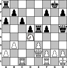 Partie-Notation im PGN-Format [Event "Sweety Tunier"] [Site "www.mySchach.de"] [Date "2006.02.28"] [Round "1"] [White "PluckyDuck"] [Black "Robert"] [ECO "A48"] [WhitemyELO "1732"] [BlackmyELO "1500"] [Result "1-0"] [TimeControl "10/2592000"] [WhiteDays "57"] [BlackDays "62"] [MySchachNr "22967"] 1. d4 Nf6 2. Nf3 g6 3. e3 a6 4. Bd3 d5 5. Nbd2 Bg7 6. O-O O-O 7. b3 Nc6 8. Bb2 Nb4 9. Be2 Bf5 10. c3 Nd3 11. Ba3 Re8 12. Nh4 Ne4 13. Nxf5 Nxc3 14. Qc2 Nxe2+ 15. Kh1 gxf5 16. Qxd3 e5 17. Qxe2 exd4 18. Rac1 c6 19. Qd3 Qg5 20. Nf3 Qh5 21. Nxd4 Re4 22. Qe2 Qg5 23. Nf3 Qh5 24. Bb2 Be5 25. Bxe5 Rxe5 26. Nd4 1-0 Stellungs-Notation im FEN-Format r5k1/1p3p1p/p1p5/3prp1q/3N4/1P2P3/P3QPPP/2R2R1K - - - 1 26 Geschlagene Figuren Weiss: Geschlagene Figuren Schwarz: Klicken Sie auf eine geschlagene Figur um den gewünschten Zug darzustellen!