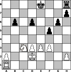Partie-Notation im PGN-Format [Event "F"] [Site "www.mySchach.de"] [Date "2006.05.06"] [Round "2"] [White "nogumo"] [Black "FreshPrinc2"] [ECO "A00"] [WhitemyELO "1816"] [BlackmyELO "1670"] [Result "1-0"] [TimeControl "10/1728000"] [WhiteDays "20"] [BlackDays "20"] [MySchachNr "25235"] 1. b4 e5 2. Bb2 Bxb4 3. Bxe5 Nf6 4. Nc3 d6 5. Bxf6 Qxf6 6. Nd5 Bxd2+ 7. Kxd2 Qd4+ 8. Ke1 Qxd1+ 9. Kxd1 Na6 10. e3 Bg4+ 11. f3 Be6 12. Bb5+ c6 13. Bxa6 Bxd5 14. Bxb7 Rb8 15. Ba6 f5 16. Ne2 Rb6 17. Bd3 g6 18. Kd2 c5 19. Rhb1 c4 20. Rxb6 axb6 21. Nc3 Bxf3 22. gxf3 cxd3 23. cxd3 1-0 Stellungs-Notation im FEN-Format 4k2r/7p/1p1p2p1/5p2/8/2NPPP2/P2K3P/R7 - k - 0 23 Geschlagene Figuren Weiss: Geschlagene Figuren Schwarz: Klicken Sie auf eine geschlagene Figur um den gewünschten Zug darzustellen!