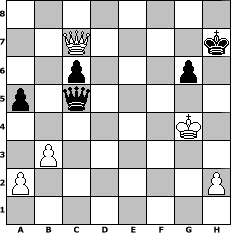 Partie-Notation im PGN-Format [Event "Come Back"] [Site "www.mySchach.de"] [Date "2015.09.04"] [Round "1"] [White "Attila89"] [Black "Joschi"] [ECO "B12"] [WhitemyELO "1508"] [BlackmyELO "1595"] [Result "1/2-1/2"] [TimeControl "10/2592000"] [WhiteDays "179"] [BlackDays "180"] [MySchachNr "100317"] 1. e4 c6 2. d4 d5 3. f3 Nd7 4. Nc3 e6 5. Bd3 dxe4 6. fxe4 Ngf6 7. Bg5 Be7 8. Nf3 h6 9. Bh4 Nb6 10. O-O Ng4 11. Bxe7 Qxe7 12. Qe2 Nf6 13. e5 Nfd5 14. Ne4 O-O 15. Nd6 Nf4 16. Qd2 Nxd3 17. Qxd3 Rb8 18. c4 Bd7 19. Nd2 Nc8 20. N2e4 Nxd6 21. Nxd6 b6 22. Qa3 a5 23. c5 bxc5 24. dxc5 f6 25. exf6 Rxf6 26. b3 Rxf1+ 27. Rxf1 Ra8 28. Qb2 Rf8 29. Rxf8+ Qxf8 30. Qc3 Qd8 31. Qf3 Be8 32. Qe4 Bd7 33. Qg6 Qe7 34. Kf2 e5 35. Qe4 Qf6+ 36. Ke3 Qg5+ 37. Kd3 g6 38. Qc4+ Kg7 39. Qf7+ Kh8 40. Qxd7 Qxg2 41. Nf7+ Kg8 42. Nxh6+ Kh8 43. Qf7 Qh3+ 44. Ke4 Qxh6 45. Qf6+ Kg8 46. Qe6+ Kh7 47. Qxe5 Qh4+ 48. Qf4 Qe1+ 49. Kf3 Qc3+ 50. Kg4 Qxc5 51. Qc7+ Kh6 52. Qf4+ Kh7 53. Qc7+ 1/2-1/2 Stellungs-Notation im FEN-Format 8/2Q4k/2p3p1/p1q5/6K1/1P6/P6P/8 - - - 5 53 Geschlagene Figuren Weiss: Geschlagene Figuren Schwarz: Klicken Sie auf eine geschlagene Figur um den gewünschten Zug darzustellen!