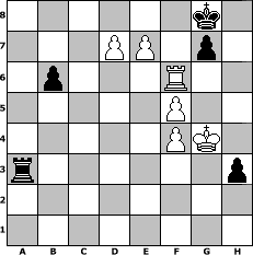 Partie-Notation im PGN-Format [Event "Schach-Romantik mit Philidor"] [Site "www.mySchach.de"] [Date "2009.01.14"] [Round "2"] [White "Joschi"] [Black "Sherlock6834"] [ECO "C41"] [WhitemyELO "1567"] [BlackmyELO "1617"] [Result "1-0"] [TimeControl "10/2592000"] [WhiteDays "171"] [BlackDays "117"] [MySchachNr "51638"] 1. e4 e5 2. Nf3 d6 3. Bc4 Nd7 4. c3 Nb6 5. Bb3 Be7 6. d4 Nf6 7. Nbd2 O-O 8. h3 c6 9. dxe5 dxe5 10. Nxe5 Bc5 11. O-O Qe7 12. Nd3 Bd7 13. Nxc5 Qxc5 14. Re1 Rad8 15. Qc2 Rfe8 16. a3 Nbd5 17. Bxd5 cxd5 18. e5 Bc6 19. Nf3 Ne4 20. Be3 Qc4 21. Bd4 Ba4 22. Qe2 Qb3 23. Rab1 Bb5 24. Qd1 Qxd1 25. Rbxd1 b6 26. Nd2 Nc5 27. Nf3 Nd3 28. Re2 Nf4 29. Red2 Be2 30. Re1 Bxf3 31. gxf3 Nxh3+ 32. Kg2 Nf4+ 33. Kg3 Ne6 34. f4 Nc5 35. Kg2 Nb3 36. Rd3 Re6 37. f5 Rc6 38. f4 Rc4 39. e6 Nxd4 40. Rxd4 Rxd4 41. cxd4 f6 42. Rc1 Kf8 43. Rc7 Ra8 44. Rd7 Rc8 45. Rxd5 Rc2+ 46. Kf3 Rxb2 47. Rd8+ Ke7 48. Rd7+ Kf8 49. Rxa7 h5 50. d5 Rd2 51. Rd7 Rd3+ 52. Ke4 Rxa3 53. d6 Ra8 54. Rf7+ Kg8 55. d7 h4 56. Rxf6 h3 57. e7 Ra4+ 58. Kf3 Ra3+ 59. Kg4 1-0 Stellungs-Notation im FEN-Format 6k1/3PP1p1/1p3R2/5P2/5PK1/r6p/8/8 - - - 4 59 Geschlagene Figuren Weiss: Geschlagene Figuren Schwarz: Klicken Sie auf eine geschlagene Figur um den gewünschten Zug darzustellen!