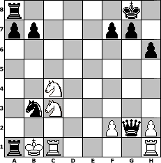 Partie-Notation im PGN-Format [Event "2.No-Engine-Schachturnier"] [Site "www.mySchach.de"] [Date "2013.08.15"] [Round "1"] [White "borsti"] [Black "Knight"] [ECO "A02"] [WhitemyELO "1231"] [BlackmyELO "1341"] [Result "0-1"] [TimeControl "10/1728000"] [WhiteDays "20"] [BlackDays "20"] [MySchachNr "89769"] 1. f4 e5 2. fxe5 d6 3. exd6 Bxd6 4. Nf3 Nf6 5. d4 Bf5 6. Bg5 O-O 7. e3 Re8 8. Bd3 Bxd3 9. Qxd3 h6 10. Bxf6 Qxf6 11. Nbd2 Nd7 12. Ne4 Qg6 13. Nfd2 Qxg2 14. O-O-O c5 15. Rdg1 Qh3 16. Nxd6 Rxe3 17. Qf5 Qxf5 18. Rf1 Qd5 19. N2c4 Re7 20. dxc5 Re2 21. b3 Qg2 22. Rd1 Rxc2+ 23. Kb1 Rxa2 24. Rc1 Nxc5 25. Nb5 Nxb3 26. Nc3 Ra1# 0-1 Stellungs-Notation im FEN-Format r5k1/pp3pp1/7p/8/2N5/1nN5/5PqP/rKR4R - - - 2 27 Geschlagene Figuren Weiss: Geschlagene Figuren Schwarz: Klicken Sie auf eine geschlagene Figur um den gewünschten Zug darzustellen!