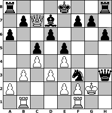 Partie-Notation im PGN-Format [Event "Albspiele 21"] [Site "www.mySchach.de"] [Date "2012.05.10"] [Round "1"] [White "MiFie"] [Black "Winston"] [ECO "B23"] [WhitemyELO "1335"] [BlackmyELO "1474"] [Result "0-1"] [TimeControl "10/1728000"] [WhiteDays "20"] [BlackDays "20"] [MySchachNr "81660"] 1. e4 c5 2. Nc3 e6 3. d3 h6 4. Nf3 a6 5. g3 Nc6 6. Bh3 Be7 7. O-O d6 8. b3 Bf6 9. Bf4 Bxc3 10. Rb1 e5 11. Be3 Bxh3 12. Re1 Bg4 13. Rf1 Qf6 14. Kg2 Nge7 15. h3 Bd7 16. Bd2 Bxd2 17. Qxd2 Qe6 18. c4 Qxh3+ 19. Kg1 Qh5 20. Nh4 Nd4 21. Qa5 Ng6 22. Qc7 Nxh4 23. gxh4 Nf3+ 24. Kh1 Qxh4+ 25. Kg2 Qh3# 0-1 Stellungs-Notation im FEN-Format r3k2r/1pQb1pp1/p2p3p/2p1p3/2P1P3/1P1P1n1q/P3PPK1/1R3R2 - kq - 2 26 Geschlagene Figuren Weiss: Geschlagene Figuren Schwarz: Klicken Sie auf eine geschlagene Figur um den gewünschten Zug darzustellen!