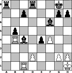 Partie-Notation im PGN-Format [Event "Orang - Utan"] [Site "www.mySchach.de"] [Date "2012.03.06"] [Round "1"] [White "OwainGwynedd"] [Black "Chaos"] [ECO "A00"] [WhitemyELO "1417"] [BlackmyELO "1847"] [Result "0-1"] [TimeControl "10/2592000"] [WhiteDays "88"] [BlackDays "88"] [MySchachNr "80344"] 1. b4 e5 2. a3 f5 3. e4 Nf6 4. Nc3 a5 5. Nf3 axb4 6. Nb1 Nc6 7. Bb2 fxe4 8. Nxe5 Nxe5 9. Bxe5 bxa3 10. Bc4 d5 11. Be2 Be6 12. O-O Be7 13. c3 a2 14. Bd4 O-O 15. f4 Qd6 16. c4 dxc4 17. Bxf6 axb1=Q 18. Rxb1 Bxf6 19. Qc2 Bd5 20. Bxc4 Qc5+ 21. Kh1 Qxc4 22. Qxc4 Bxc4 23. Rfc1 b5 24. Rb4 Rfd8 0-1 Stellungs-Notation im FEN-Format r2r2k1/2p3pp/5b2/1p6/1Rb1pP2/8/3P2PP/2R4K - - - 2 25 Geschlagene Figuren Weiss: Geschlagene Figuren Schwarz: Klicken Sie auf eine geschlagene Figur um den gewünschten Zug darzustellen!