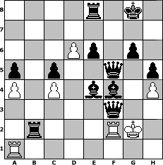 Partie-Notation im PGN-Format [Event "Valjaux"] [Site "www.mySchach.de"] [Date "2025.07.23"] [Round "1"] [White "Achimkogge"] [Black "Haneken"] [ECO "A06"] [WhitemyELO "1216"] [BlackmyELO "1123"] [Result "0-1"] [TimeControl "10/2592000"] [WhiteDays "143"] [BlackDays "129"] [MySchachNr "133527"] 1. Nf3 d5 2. d4 e6 3. c3 Bd6 4. b4 Nc6 5. e3 Nge7 6. Ng5 O-O 7. Bd3 g6 8. f4 h6 9. N5f3 Nf5 10. g3 Qf6 11. Bxf5 Qxf5 12. a3 b6 13. h3 b5 14. g4 Qe4 15. O-O a6 16. Kg2 f5 17. gxf5 Rxf5 18. h4 h5 19. Qe2 a5 20. Qxb5 Ba6 21. Qxc6 Ra7 22. Qe8+ Rf8 23. Rf2 Rxe8 24. Kg3 Qf5 25. Nh2 Bc4 26. Nd2 Bd3 27. b5 Bxb5 28. a4 Bd3 29. e4 dxe4 30. Ra2 Rb7 31. c4 c5 32. d5 Rb4 33. Bb2 e3 34. Rf3 exd2 35. Ra1 Rxb2 36. Rf2 Bb1 37. Rf1 Bc2 38. Kg2 Bxf4 39. d6 Be4+ 40. Nf3 d1=Q+ 41. Rf2 Qxf3+ 0-1 Stellungs-Notation im FEN-Format 4r1k1/8/3Pp1p1/p1p2q1p/P1P1bb1P/5q2/1r3RK1/R7 - - - 0 42 Geschlagene Figuren Weiss: Geschlagene Figuren Schwarz: Klicken Sie auf eine geschlagene Figur um den gewünschten Zug darzustellen!