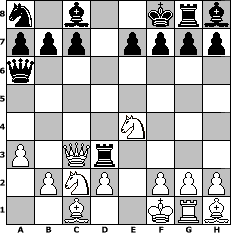 Partie-Notation im PGN-Format [Event "Andys MySchach-960-Abschiedsturnier 2017"] [Site "www.mySchach.de"] [Date "2017.02.18"] [Round "1"] [White "Knight"] [Black "Grubengeist"] [Variant "Fischerrandom"] [SetUp "1"] [FEN "nnbrqkrb/pppppppp/8/8/8/8/PPPPPPPP/NNBRQKRB w KQkq - 0 1"] [WhitemyELO "1189"] [BlackmyELO "2036"] [Result "0-1"] [TimeControl "10/2592000"] [WhiteDays "30"] [BlackDays "20"] [MySchachNr "107009"] 1. d4 d5 2. e4 Qb5+ 3. Rd3 dxe4 4. Nc3 Qa6 5. Nxe4 Nc6 6. a3 Nxd4 7. Qc3 Nxc2 8. Nxc2 Rxd3 0-1 Stellungs-Notation im FEN-Format n1b2krb/ppp1pppp/q7/8/4N3/P1Qr4/1PNP1PPP/2B2KRB - Kk - 0 9 Geschlagene Figuren Weiss: Geschlagene Figuren Schwarz: Klicken Sie auf eine geschlagene Figur um den gewünschten Zug darzustellen!