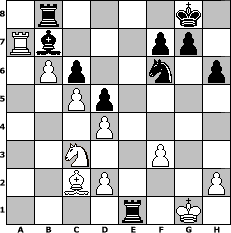 Partie-Notation im PGN-Format [Event "Achat"] [Site "www.mySchach.de"] [Date "2022.05.09"] [Round "1"] [White "Mynona"] [Black "Kerendar"] [ECO "D00"] [WhitemyELO "1472"] [BlackmyELO "1496"] [Result "0-1"] [TimeControl "10/864000"] [WhiteDays "10"] [BlackDays "10"] [MySchachNr "125657"] 1. d4 d5 2. Bf4 e6 3. e3 a6 4. a3 Bd6 5. Bxd6 Qxd6 6. c4 c5 7. Nf3 Nf6 8. Nc3 O-O 9. Ne5 Nc6 10. Nxc6 Qxc6 11. Qa4 cxd4 12. Qxc6 bxc6 13. exd4 Re8 14. Bd3 e5 15. O-O e4 16. Bc2 a5 17. b4 axb4 18. axb4 Ba6 19. b5 Bb7 20. c5 Nh5 21. b6 Nf6 22. Ra7 Rab8 23. Re1 h6 24. f3 exf3 25. gxf3 Rxe1+ 0-1 Stellungs-Notation im FEN-Format 1r4k1/Rb3pp1/1Pp2n1p/2Pp4/3P4/2N2P2/2BP3P/4r1K1 - - - 0 26 Geschlagene Figuren Weiss: Geschlagene Figuren Schwarz: Klicken Sie auf eine geschlagene Figur um den gewünschten Zug darzustellen!