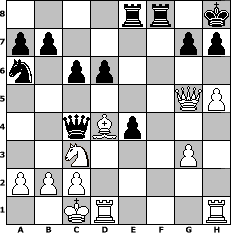 Partie-Notation im PGN-Format [Event "\" Zum Ab-u.Angew"] [Site "www.mySchach.de"] [Date "2012.08.06"] [Round "1"] [White "Tigerle"] [Black "BobbyF4"] [ECO "C40"] [WhitemyELO "1557"] [BlackmyELO "1544"] [Result "1-0"] [TimeControl "10/864000"] [WhiteDays "10"] [BlackDays "00"] [MySchachNr "83172"] 1. e4 e5 2. Nf3 f5 3. Nxe5 Qf6 4. d4 d6 5. Nc4 fxe4 6. Nc3 Qg6 7. Qe2 Nf6 8. Bd2 Be7 9. O-O-O O-O 10. h4 c6 11. h5 Qf5 12. g3 Ng4 13. Bh3 Qxf2 14. Bxg4 Bxg4 15. Qxg4 Na6 16. Qe6+ Kh8 17. Qxe7 Rae8 18. Qg5 Qxd4 19. Be3 Qxc4 20. Bd4 1-0 Stellungs-Notation im FEN-Format 4rr1k/pp4pp/n1pp4/6QP/2qBp3/2N3P1/PPP5/2KR3R - - - 1 20 Geschlagene Figuren Weiss: Geschlagene Figuren Schwarz: Klicken Sie auf eine geschlagene Figur um den gewünschten Zug darzustellen!