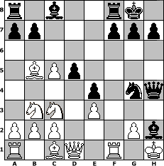 Partie-Notation im PGN-Format [Event "Hundstage"] [Site "www.mySchach.de"] [Date "2013.07.21"] [Round "1"] [White "Knight"] [Black "espero"] [ECO "A00"] [WhitemyELO "1221"] [BlackmyELO "1716"] [Result "0-1"] [TimeControl "10/864000"] [WhiteDays "20"] [BlackDays "20"] [MySchachNr "89376"] 1. Nh3 d5 2. Ng5 e5 3. N5f3 e4 4. Nd4 c5 5. Nb3 Nc6 6. e3 Nf6 7. Bb5 Bd6 8. O-O O-O 9. Nc3 Ne5 10. d4 Neg4 11. dxc5 Bxh2+ 12. Kh1 Nxf2+ 13. Rxf2 Ng4 14. Rf1 Qh4 0-1 Stellungs-Notation im FEN-Format r1b2rk1/pp3ppp/8/1BPp4/4p1nq/1NN1P3/PPP3Pb/R1BQ1R1K - - - 3 15 Geschlagene Figuren Weiss: Geschlagene Figuren Schwarz: Klicken Sie auf eine geschlagene Figur um den gewünschten Zug darzustellen!