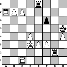 Partie-Notation im PGN-Format [Event "Abtausch Variante"] [Site "www.mySchach.de"] [Date "2007.02.05"] [Round "1"] [White "rikilatic"] [Black "LeeBrilleaux"] [ECO "D35"] [WhitemyELO "1535"] [BlackmyELO "1472"] [Result "1-0"] [TimeControl "10/1728000"] [WhiteDays "65"] [BlackDays "77"] [MySchachNr "32309"] 1. d4 d5 2. c4 e6 3. Nc3 Nf6 4. cxd5 Nxd5 5. Nxd5 exd5 6. Bf4 Nc6 7. e3 g6 8. Bb5 Bb4+ 9. Kf1 O-O 10. h4 h5 11. Bh6 Re8 12. Bxc6 bxc6 13. Qc2 Ba6+ 14. Ne2 Qf6 15. a3 Bd6 16. Qxc6 Bd3 17. Qxd5 Rab8 18. b4 Bg3 19. Qf3 Qxf3 20. gxf3 Bd6 21. Ke1 f6 22. Ng3 Bxg3 23. fxg3 Rbd8 24. Kd2 Bb5 25. Rhc1 c6 26. a4 Kh7 27. axb5 Kxh6 28. bxc6 Rc8 29. Rxa7 g5 30. hxg5+ Kxg5 31. b5 h4 32. gxh4+ Kh5 33. b6 Rg8 34. b7 Rg2+ 35. Kd3 Re8 36. c7 1-0 Stellungs-Notation im FEN-Format 4r3/RPP5/5p2/7k/3P3P/3KPP2/6r1/2R5 - - - 0 36 Geschlagene Figuren Weiss: ![]() ![]() ![]() ![]() ![]() ![]() ![]() ![]() ![]() ![]() ![]() ![]() ![]() ![]() ![]() Geschlagene Figuren Schwarz: ![]() ![]() ![]() ![]() ![]() ![]() ![]() ![]() ![]() ![]() ![]() ![]() ![]() ![]() ![]() Klicken Sie auf eine geschlagene Figur um den gewünschten Zug darzustellen!