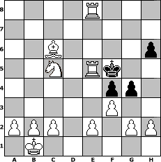 Partie eroeffnet am 23.06.2004, 00:05 Uhr und beendet am 03.08.2004, 20:31 Uhr Spieler weiss: MaxPayne Spieler schwarz: Master1 MaxPayne hat die Partie gewonnen! | |