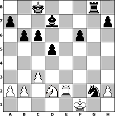 Partie-Notation im PGN-Format [Event "around 1500"] [Site "www.mySchach.de"] [Date "2005.02.03"] [Round "1"] [White "Andreas"] [Black "rikilatic"] [ECO "C41"] [WhitemyELO "1552"] [BlackmyELO "1573"] [Result "0-1"] [TimeControl "10/864000"] [WhiteDays "10"] [BlackDays "10"] [MySchachNr "10148"] 1. e4 e5 2. Nf3 d6 3. d4 exd4 4. Nxd4 Qf6 5. c3 Nh6 6. Be2 c6 7. O-O Qg6 8. Qd3 Nd7 9. f4 Nc5 10. Qe3 Qxe4 11. Bf3 Qxe3+ 12. Bxe3 Bd7 13. Nd2 Ne6 14. Nxe6 Bxe6 15. Bf2 d5 16. Rae1 O-O-O 17. Bg3 Nf5 18. Bf2 b6 19. g4 Nh6 20. f5 Bd7 21. Bg3 Bc5+ 22. Bf2 Bxf2+ 23. Rxf2 f6 24. Re7 g6 25. Nb3 gxf5 26. gxf5 Nxf5 27. Ree2 Rhg8+ 28. Rg2 Rxg2+ 29. Bxg2 Rg8 30. Kf1 Nh4 31. Nd2 Nxg2 0-1 Stellungs-Notation im FEN-Format 2k3r1/p2b3p/1pp2p2/3p4/8/2P5/PP1NR1nP/5K2 - - - 0 32 Geschlagene Figuren Weiss: Geschlagene Figuren Schwarz: Klicken Sie auf eine geschlagene Figur um den gewünschten Zug darzustellen!
