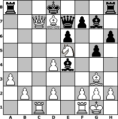 Partie-Notation im PGN-Format [Event "Veschachert # 5"] [Site "www.mySchach.de"] [Date "2013.07.23"] [Round "1"] [White "Macks"] [Black "Hobbykegler"] [ECO "D11"] [WhitemyELO "1245"] [BlackmyELO "1049"] [Result "1-0"] [TimeControl "10/1728000"] [WhiteDays "55"] [BlackDays "38"] [MySchachNr "89418"] 1. d4 d5 2. c4 c6 3. Nf3 Qc7 4. Nc3 Na6 5. Bg5 h6 6. Bh4 g5 7. Bg3 Qd7 8. e3 e6 9. c5 Nb4 10. a3 Na6 11. Ne5 Qe7 12. Bd3 Bg7 13. O-O Nf6 14. Rc1 b6 15. cxb6 axb6 16. Nxc6 Qd7 17. Ne5 Qe7 18. Bb5+ Nd7 19. e4 dxe4 20. Nxe4 Bb7 21. Bxd7+ Kd8 22. Qb3 Bxe4 23. Qxb6+ Nc7 24. Qxc7# 1-0 Stellungs-Notation im FEN-Format r2k3r/2QBqpb1/4p2p/4N1p1/3Pb3/P5B1/1P1P1PPP/2R2RK1 - - - 0 24 Geschlagene Figuren Weiss: Geschlagene Figuren Schwarz: Klicken Sie auf eine geschlagene Figur um den gewünschten Zug darzustellen!