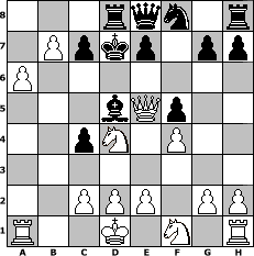 Partie-Notation im PGN-Format [Event "5. HK-960-Pokal"] [Site "www.mySchach.de"] [Date "2012.09.11"] [Round "2"] [White "ChristinaH"] [Black "Haki"] [Variant "Fischerrandom"] [SetUp "1"] [FEN "rbbknnqr/pppppppp/8/8/8/8/PPPPPPPP/RBBKNNQR w KQkq - 0 1"] [WhitemyELO "1522"] [BlackmyELO "1320"] [Result "1-0"] [TimeControl "10/1728000"] [WhiteDays "20"] [BlackDays "20"] [MySchachNr "83870"] 1. b4 d5 2. a4 Nd6 3. Ba2 Be6 4. a5 a6 5. Bb2 Ba7 6. Nf3 f6 7. Bd4 Bxd4 8. Nxd4 O-O-O 9. f4 f5 10. Qe3 Nc4 11. Bxc4 dxc4 12. b5 Qf7 13. bxa6 Kd7 14. axb7 Bd5 15. a6 Qe8 16. Qe5 1-0 Stellungs-Notation im FEN-Format 3rqn1r/1Ppkp1pp/P7/3bQp2/2pN1P2/8/2PPP1PP/R2K1N1R - KQ - 2 16 Geschlagene Figuren Weiss: Geschlagene Figuren Schwarz: Klicken Sie auf eine geschlagene Figur um den gewünschten Zug darzustellen!