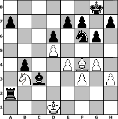 Partie-Notation im PGN-Format [Event "Nur sooooooo"] [Site "www.mySchach.de"] [Date "2015.10.01"] [Round "1"] [White "beowulf"] [Black "Joschi"] [ECO "A15"] [WhitemyELO "1343"] [BlackmyELO "1603"] [Result "0-1"] [TimeControl "10/864000"] [WhiteDays "34"] [BlackDays "30"] [MySchachNr "100589"] 1. c4 Nf6 2. d4 c5 3. d5 b5 4. b3 bxc4 5. bxc4 g6 6. Bg5 Bg7 7. Nc3 Qa5 8. Qc2 Nxd5 9. cxd5 Bxc3+ 10. Kd1 Bxa1 11. e4 Bg7 12. Nf3 d6 13. Bd3 Nd7 14. Ke2 Nf6 15. Rb1 Ba6 16. Bxa6 Qxa6+ 17. Ke1 O-O 18. Nd2 Rab8 19. Rxb8 Rxb8 20. f3 Rb4 21. Kf2 Qb7 22. h3 Rb2 23. Qc4 Nh5 24. g4 Bd4+ 25. Ke1 Nf6 26. Bf4 Qb4 27. Qxb4 cxb4 28. Nb3 Bc3+ 29. Kd1 Rxa2 0-1 Stellungs-Notation im FEN-Format 6k1/p3pp1p/3p1np1/3P4/1p2PBP1/1Nb2P1P/r7/3K4 - - - 0 30 Geschlagene Figuren Weiss: Geschlagene Figuren Schwarz: Klicken Sie auf eine geschlagene Figur um den gewünschten Zug darzustellen!