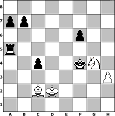 Partie-Notation im PGN-Format [Event ""Freibier f"] [Site "www.mySchach.de"] [Date "2005.05.27"] [Round "1"] [White "Andreschach (adv.)"] [Black "Baehr008"] [ECO "A46"] [WhitemyELO "1674"] [BlackmyELO "1824"] [Result "0-1"] [TimeControl "10/1728000"] [WhiteDays "089"] [BlackDays "100"] [MySchachNr "13636"] 1. d4 Nf6 2. Nf3 d5 3. c4 e6 4. Nc3 c6 5. e3 Bd6 6. Bd3 Nbd7 7. O-O O-O 8. e4 dxe4 9. Nxe4 Nxe4 10. Bxe4 h6 11. Bc2 e5 12. Re1 exd4 13. Qxd4 Nf6 14. Qc3 Bg4 15. Ne5 Re8 16. Bf4 Bc5 17. h3 Be6 18. Rad1 Qb6 19. Be3 Bxe3 20. Rxe3 Rad8 21. Rde1 Qc5 22. b4 Qd4 23. Qxd4 Rxd4 24. a4 Rc8 25. Rd3 Rxd3 26. Bxd3 c5 27. b5 g5 28. a5 Rd8 29. Kf1 Kg7 30. Re3 Nh5 31. Ke1 f6 32. Ng4 Nf4 33. Bf1 Bxc4 34. Bxc4 Nxg2+ 35. Ke2 Nxe3 36. Nxe3 h5 37. f4 gxf4 38. Nd5 Kg6 39. Nxf4+ Kf5 40. Nxh5 Rd4 41. Bd3+ Ke5 42. Ng3 Rb4 43. Nf1 c4 44. Bc2 Rxb5 45. Ne3 Rc5 46. Kd2 Kf4 47. Ng4 Rxa5 0-1 Stellungs-Notation im FEN-Format 8/pp6/5p2/r7/2p2kN1/7P/2BK4/8 - - - 0 48 Geschlagene Figuren Weiss: Geschlagene Figuren Schwarz: Klicken Sie auf eine geschlagene Figur um den gewünschten Zug darzustellen!