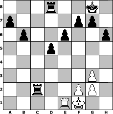 Partie-Notation im PGN-Format [Event "Mailüfterl"] [Site "www.mySchach.de"] [Date "2018.04.23"] [Round "1"] [White "alpacino"] [Black "espero"] [ECO "C00"] [WhitemyELO "1315"] [BlackmyELO "1959"] [Result "0-1"] [TimeControl "10/1728000"] [WhiteDays "79"] [BlackDays "55"] [MySchachNr "112055"] 1. e4 e6 2. d3 d5 3. e5 c5 4. d4 cxd4 5. Qxd4 Nc6 6. Bb5 Nge7 7. Bxc6+ Nxc6 8. Qe3 Qc7 9. Nf3 b6 10. O-O Ba6 11. Nc3 Bxf1 12. Kxf1 Bc5 13. Qe2 O-O 14. Nb5 Qd7 15. Nbd4 Bxd4 16. Be3 Bxb2 17. Rb1 Bxe5 18. a3 Bf6 19. Qb5 Rfd8 20. Bg5 Bxg5 21. Nxg5 h6 22. Nf3 Na5 23. Qd3 Rac8 24. Ne5 Qc7 25. Re1 Nc4 26. Ng4 Qf4 27. Qg3 Qxg3 28. hxg3 Nxa3 29. Ne3 Nxc2 30. Nxc2 Rxc2 0-1 Stellungs-Notation im FEN-Format 3r2k1/p4pp1/1p2p2p/3p4/8/6P1/2r2PP1/4RK2 - - - 0 31 Geschlagene Figuren Weiss: Geschlagene Figuren Schwarz: Klicken Sie auf eine geschlagene Figur um den gewünschten Zug darzustellen!