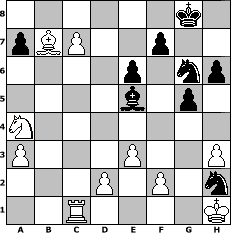 Partie-Notation im PGN-Format [Event "Human Brain Turnier 2014"] [Site "www.mySchach.de"] [Date "2014.06.12"] [Round "1"] [White "FrankB"] [Black "sprinterde"] [ECO "A40"] [WhitemyELO "1653"] [BlackmyELO "1694"] [Result "1-0"] [TimeControl "10/2592000"] [WhiteDays "86"] [BlackDays "51"] [MySchachNr "94757"] 1. d4 e6 2. a3 d5 3. Bf4 Nc6 4. Nf3 h6 5. e3 g5 6. Bg3 Nge7 7. h3 Bg7 8. c4 Nf5 9. Bh2 O-O 10. Nc3 dxc4 11. Bxc4 b6 12. Rc1 Bb7 13. b4 Nce7 14. O-O c5 15. bxc5 bxc5 16. dxc5 Qxd1 17. Rfxd1 Bxf3 18. gxf3 Rfd8 19. Na4 Nh4 20. Be2 Neg6 21. c6 Rac8 22. Rxd8+ Rxd8 23. c7 Rc8 24. Ba6 Nxf3+ 25. Kh1 Nxh2 26. Bxc8 Be5 27. Bb7 1-0 Stellungs-Notation im FEN-Format 6k1/pBP2p2/4p1np/4b1p1/N7/P3P2P/3P1P1n/2R4K - - - 2 27 Geschlagene Figuren Weiss: Geschlagene Figuren Schwarz: Klicken Sie auf eine geschlagene Figur um den gewünschten Zug darzustellen!