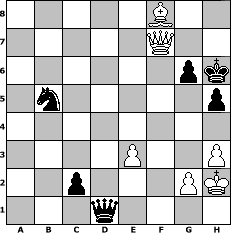 Partie-Notation im PGN-Format [Event "Schach dem Osterhasen IV"] [Site "www.mySchach.de"] [Date "2015.03.29"] [Round "1"] [White "hape50"] [Black "beowulf"] [ECO "D00"] [WhitemyELO "1330"] [BlackmyELO "1344"] [Result "1-0"] [TimeControl "10/2592000"] [WhiteDays "149"] [BlackDays "136"] [MySchachNr "98729"] 1. d4 d5 2. e3 c5 3. b3 g6 4. Nf3 Bg7 5. c3 cxd4 6. Nxd4 Nf6 7. Nd2 Bg4 8. Be2 Bxe2 9. Qxe2 O-O 10. h3 e6 11. O-O Nc6 12. N4f3 a6 13. b4 b5 14. Bb2 Na7 15. Rab1 Nc8 16. Ne5 Nd6 17. f4 Nc4 18. Ndxc4 bxc4 19. a4 Ne4 20. Rf3 Bxe5 21. fxe5 f6 22. exf6 Rxf6 23. Rbf1 Qe7 24. Ba1 Raf8 25. Bb2 Rxf3 26. Rxf3 Rxf3 27. Qxf3 Qg7 28. b5 axb5 29. axb5 Qb7 30. Ba3 h5 31. Qf8+ Kh7 32. Qe8 Nxc3 33. Qxe6 Nxb5 34. Bc5 Qg7 35. Qxd5 c3 36. Qc4 Qd7 37. Bb4 Qd1+ 38. Kh2 c2 39. Qf7+ Kh6 40. Bf8+ 1-0 Stellungs-Notation im FEN-Format 5B2/5Q2/6pk/1n5p/8/4P2P/2p3PK/3q4 - - - 3 40 Geschlagene Figuren Weiss: Geschlagene Figuren Schwarz: Klicken Sie auf eine geschlagene Figur um den gewünschten Zug darzustellen!