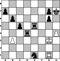 Partie-Notation im PGN-Format [Event "11. HK-Turnier"] [Site "www.mySchach.de"] [Date "2009.10.05"] [Round "1"] [White "Hobbykegler"] [Black "Seneca"] [ECO "C41"] [WhitemyELO "1065"] [BlackmyELO "1449"] [Result "0-1"] [TimeControl "10/2592000"] [WhiteDays "23"] [BlackDays "29"] [MySchachNr "59594"] 1. e4 e5 2. Nf3 d6 3. Bc4 h6 4. O-O Be7 5. Re1 Nf6 6. d4 Nbd7 7. dxe5 dxe5 8. Nc3 O-O 9. b3 Bb4 10. a3 Bxc3 11. Bd2 Bxa1 12. Qxa1 c6 13. Bb4 c5 14. Bd2 b6 15. Nxe5 Nxe5 16. Qxe5 Qxd2 17. Kf1 Qxc2 18. h3 Bb7 19. f3 Rad8 20. Re2 Qc1+ 21. Kf2 Qxa3 22. g4 Ba6 23. Bxa6 Qxa6 24. g5 Rfe8 25. Qf5 hxg5 26. Qxg5 Qd3 27. e5 Rd5 28. Re3 Qc2+ 29. Kg3 Qg6 30. Qxg6 fxg6 31. f4 Rd4 32. h4 Nd5 33. Re2 Nxf4 34. Re1 Nd3 35. Re2 Rxe5 36. Rg2 Ne1 37. Rg1 Kh7 0-1 Stellungs-Notation im FEN-Format 8/p5pk/1p4p1/2p1r3/3r3P/1P4K1/8/4n1R1 - - - 4 38 Geschlagene Figuren Weiss: Geschlagene Figuren Schwarz: Klicken Sie auf eine geschlagene Figur um den gewünschten Zug darzustellen!