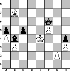Partie-Notation im PGN-Format [Event "Bremer Schl"] [Site "www.mySchach.de"] [Date "2008.11.01"] [Round "2"] [White "dbuse"] [Black "Fighter"] [ECO "B06"] [WhitemyELO "2055"] [BlackmyELO "2087"] [Result "1/2-1/2"] [TimeControl "10/2592000"] [WhiteDays "174"] [BlackDays "150"] [MySchachNr "49442"] 1. e4 g6 2. d4 d6 3. Nf3 Bg7 4. Nc3 Nf6 5. Be2 O-O 6. O-O Bg4 7. Be3 Nc6 8. d5 Bxf3 9. Bxf3 Ne5 10. Be2 c6 11. f4 Ned7 12. dxc6 bxc6 13. Qd3 Qb8 14. a3 Nc5 15. Bxc5 dxc5 16. b3 Qb6 17. Kh1 Rad8 18. Qf3 e5 19. f5 Qa5 20. Nd1 Rd4 21. Nf2 gxf5 22. Qxf5 Qd2 23. Bc4 Qxc2 24. Rae1 Qd2 25. Ng4 Nxg4 26. Qxg4 Kh8 27. Qg3 f6 28. Qh3 a5 29. a4 Rfd8 30. Re3 Qc2 31. Qf5 Rd1 32. Rh3 h6 33. Rhf3 R1d4 34. Re3 Rd1 35. Ree1 Rxe1 36. Rxe1 Qd2 37. Rf1 Qd7 38. Qf2 Qd4 39. Qf3 Qd2 40. Qh5 Qd7 41. h3 Qe7 42. Kh2 Rd7 43. Rf3 Rd4 44. Re3 Rd6 45. Rg3 Qf8 46. Rg6 f5 47. exf5 Rxg6 48. Qxg6 Qf6 49. Qe8+ Bf8 50. Bd3 Qe7 51. Qa8 e4 52. Bxe4 h5 53. Kg1 h4 54. Qxc6 Qe5 55. Qd5 Bd6 56. Qxe5+ Bxe5 57. Kf2 Kg7 58. Kf3 Kf6 59. Bd3 Bg3 60. Ke4 Be1 61. Ba6 Bc3 62. Bb7 Bb4 1/2-1/2 Stellungs-Notation im FEN-Format 8/1B6/5k2/p1p2P2/Pb2K2p/1P5P/6P1/8 - - - 12 63 Geschlagene Figuren Weiss: Geschlagene Figuren Schwarz: Klicken Sie auf eine geschlagene Figur um den gewünschten Zug darzustellen!