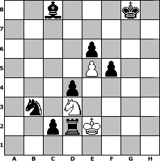 Partie-Notation im PGN-Format [Event "Turnier zum Tag der deutschen Einheit 2012"] [Site "www.mySchach.de"] [Date "2012.10.03"] [Round "1"] [White "augustus"] [Black "Haki"] [ECO "C00"] [WhitemyELO "1284"] [BlackmyELO "1315"] [Result "0-1"] [TimeControl "10/1728000"] [WhiteDays "20"] [BlackDays "20"] [MySchachNr "84214"] 1. e4 e6 2. Bc4 d5 3. Bb5+ c6 4. Ba4 b5 5. Bb3 Nf6 6. e5 Nfd7 7. f4 Be7 8. d4 c5 9. c3 c4 10. Bc2 O-O 11. g3 f5 12. Nh3 Qe8 13. a3 a6 14. b4 Qd8 15. Rg1 Nc6 16. Be3 Qe8 17. Nd2 g6 18. Qe2 a5 19. a4 axb4 20. a5 bxc3 21. Nb1 Bb4 22. Kf1 Rxa5 23. Rxa5 Nxa5 24. g4 h6 25. Nf2 Rf7 26. Nh3 Nf8 27. g5 hxg5 28. Nxg5 Ra7 29. h4 Nh7 30. Nxh7 Rxh7 31. Qh2 Be7 32. h5 Rh6 33. Bf2 b4 34. Rxg6+ Qxg6 35. Qg3 Qxg3 36. Bxg3 Rxh5 37. Bd1 Rh1+ 38. Ke2 Bh4 39. Bxh4 Rxh4 40. Kf2 Rxf4+ 41. Kg1 Rxd4 42. Bc2 b3 43. Bxb3 Nxb3 44. Nxc3 Rd3 45. Ne2 Rd1+ 46. Kf2 d4 47. Nf4 c3 48. Ke2 c2 49. Nd3 Rd2+ 0-1 Stellungs-Notation im FEN-Format 2b3k1/8/4p3/4Pp2/3p4/1n1N4/2prK3/8 - - - 2 50 Geschlagene Figuren Weiss: Geschlagene Figuren Schwarz: Klicken Sie auf eine geschlagene Figur um den gewünschten Zug darzustellen!
