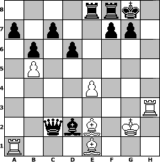 Partie-Notation im PGN-Format [Event "Herbstturnier 2022"] [Site "www.mySchach.de"] [Date "2022.09.26"] [Round "2"] [White "lotchi"] [Black "MiFie"] [ECO "C22"] [WhitemyELO "1263"] [BlackmyELO "1087"] [Result "0-1"] [TimeControl "10/1728000"] [WhiteDays "78"] [BlackDays "55"] [MySchachNr "127306"] 1. e4 e5 2. d4 exd4 3. Qxd4 Nc6 4. Qd2 Bb4 5. c3 Ba5 6. b4 Bb6 7. a4 Nf6 8. b5 Ne5 9. f3 O-O 10. g4 Bxg1 11. Qg2 Bc5 12. h4 h6 13. g5 Nh7 14. Bf4 d6 15. Nd2 Nd3+ 16. Bxd3 b6 17. gxh6 Qf6 18. Rg1 Qxh4+ 19. Bg3 Qxh6 20. Rh1 Qe3+ 21. Be2 Qxc3 22. Rd1 Ng5 23. Kf1 Be6 24. Nb1 Qc2 25. Nd2 Be3 26. Qh2 Nh3 27. Ke1 Qxa4 28. Kf1 Bh6 29. f4 Bd7 30. Kg2 Rae8 31. Ra1 Qc2 32. Be1 Bxf4 33. Qxh3 Bxh3+ 34. Rxh3 Bxd2 0-1 Stellungs-Notation im FEN-Format 4rrk1/p1p2pp1/1p1p4/1P6/4P3/7R/2qbB1K1/R3B3 - - - 0 35 Geschlagene Figuren Weiss: Geschlagene Figuren Schwarz: Klicken Sie auf eine geschlagene Figur um den gewünschten Zug darzustellen!