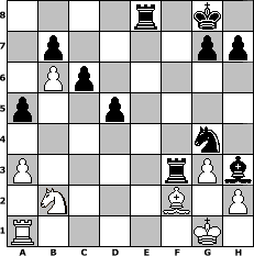 Partie-Notation im PGN-Format [Event "Schach Master"] [Site "www.mySchach.de"] [Date "2004.07.16"] [Round "1"] [White "tschulz"] [Black "myfairlady"] [ECO "A00"] [WhitemyELO "1353"] [BlackmyELO "1760"] [Result "0-1"] [TimeControl "10/864000"] [WhiteDays "39"] [BlackDays "37"] [MySchachNr "5704"] 1. b4 d5 2. Bb2 Qd6 3. a3 e5 4. Nf3 f6 5. e3 Be6 6. d4 e4 7. Nfd2 c6 8. c4 a5 9. c5 Qc7 10. Nc3 Nh6 11. b5 Nd7 12. b6 Qd8 13. Be2 f5 14. O-O Qh4 15. f3 Be7 16. Rf2 f4 17. Nf1 O-O 18. Qe1 Nxc5 19. dxc5 fxe3 20. Nxe3 Bxc5 21. g3 Qe7 22. Na4 Bxe3 23. Bc1 Bxf2+ 24. Qxf2 exf3 25. Bxf3 Bg4 26. Qe3 Qxe3+ 27. Bxe3 Rxf3 28. Bc5 Bh3 29. Nb2 Re8 30. Bf2 Ng4 0-1 Stellungs-Notation im FEN-Format 4r1k1/1p4pp/1Pp5/p2p4/6n1/P4rPb/1N3B1P/R5K1 - - - 6 31 Geschlagene Figuren Weiss: Geschlagene Figuren Schwarz: Klicken Sie auf eine geschlagene Figur um den gewünschten Zug darzustellen!