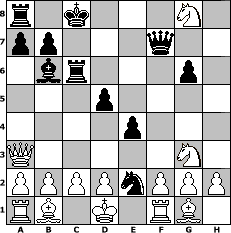 Partie-Notation im PGN-Format [Event "Mit Chess960 durch\' s Jahr"] [Site "www.mySchach.de"] [Date "2010.05.31"] [Round "1"] [White "Erich"] [Black "sterpfi"] [Variant "Fischerrandom"] [SetUp "1"] [FEN "rbkrqnbn/pppppppp/8/8/8/8/PPPPPPPP/RBKRQNBN w KQkq - 0 1"] [WhitemyELO "1862"] [BlackmyELO "1538"] [Result "1-0"] [TimeControl "10/2592000"] [WhiteDays "60"] [BlackDays "47"] [MySchachNr "65921"] 1. f4 c6 2. f5 e6 3. e4 d5 4. exd5 cxd5 5. Nhg3 e5 6. Nh5 f6 7. Nxg7 Qf7 8. Qg3 Nhg6 9. Nh5 e4 10. fxg6 hxg6 11. Qc3+ Bc7 12. Nxf6 Ne6 13. Nxg8 Nf4 14. Ng3 Rd6 15. Qe3 Bb6 16. Qa3 Rc6 17. Rf1 Ne2+ 18. Kd1 1-0 Stellungs-Notation im FEN-Format r1k3N1/pp3q2/1br3p1/3p4/4p3/Q5N1/PPPPnPPP/RB1K1RB1 - q - 10 18 Geschlagene Figuren Weiss: Geschlagene Figuren Schwarz: Klicken Sie auf eine geschlagene Figur um den gewünschten Zug darzustellen!