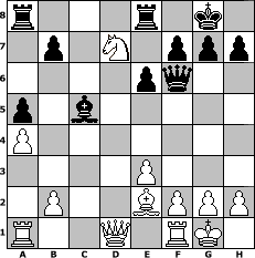 Partie-Notation im PGN-Format [Event "Spring 2017"] [Site "www.mySchach.de"] [Date "2017.03.21"] [Round "1"] [White "Erhaem"] [Black "Knight"] [ECO "D03"] [WhitemyELO "1617"] [BlackmyELO "1181"] [Result "1-0"] [TimeControl "10/2592000"] [WhiteDays "47"] [BlackDays "60"] [MySchachNr "107458"] 1. d4 d5 2. Nf3 Nf6 3. Bg5 Nc6 4. e3 e6 5. Be2 Bb4+ 6. c3 Ba5 7. O-O O-O 8. Nbd2 Re8 9. c4 dxc4 10. Nxc4 Bb6 11. Nfe5 Nxe5 12. Nxe5 Bd7 13. a4 a5 14. Bh4 c5 15. dxc5 Bxc5 16. Bxf6 Qxf6 17. Nxd7 1-0 Stellungs-Notation im FEN-Format r3r1k1/1p1N1ppp/4pq2/p1b5/P7/4P3/1P2BPPP/R2Q1RK1 - - - 0 17 Geschlagene Figuren Weiss: Geschlagene Figuren Schwarz: Klicken Sie auf eine geschlagene Figur um den gewünschten Zug darzustellen!